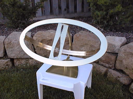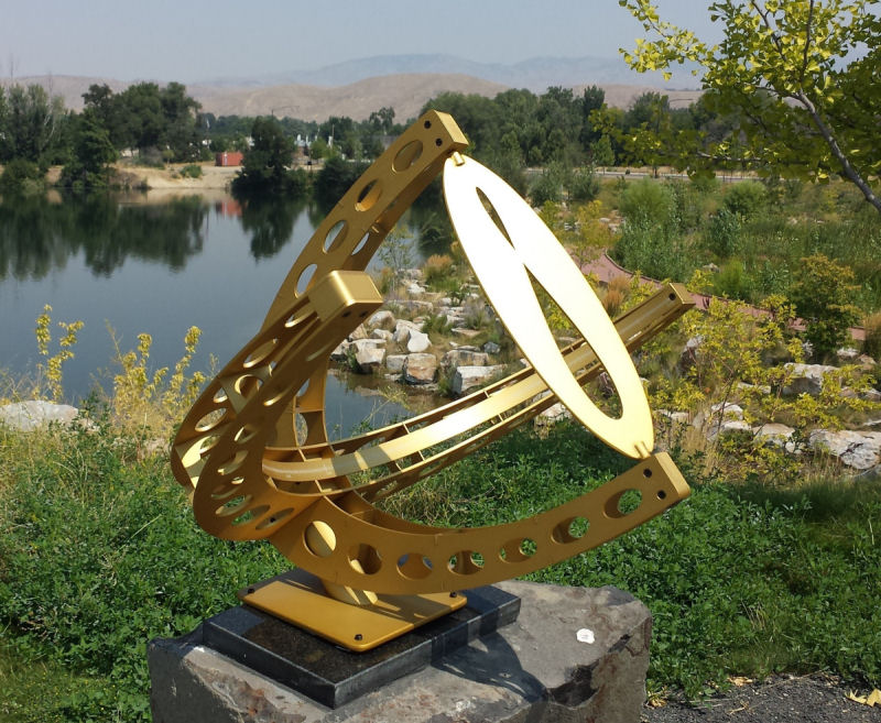 I placed this Stainless Steel 6'w x 4'h x 4'd Sundial Sculpture (110k.jpg) in Boise's Ann Morrison Park in 1998. Materials and labor for this sundial were donated by JST Manufacturing Inc. I really like this design for its simplicity, and because it visually demonstrates very clearly the apparent motion of the sun "about" the earth throughout the day and the year. It indicates the time to within less than a minute, the date to within the day and it also adjusts for Daylight Saving Time! This analemmic-equatorial sundial appears in Wikipedia